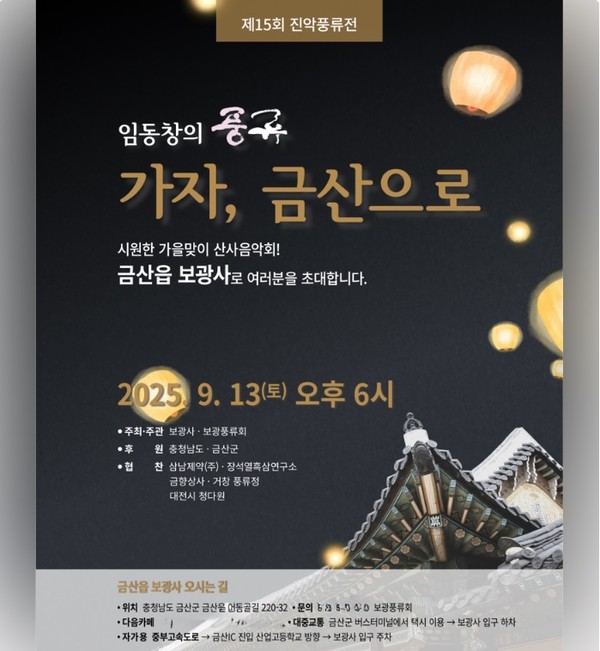 금산군(군수 박범인)은 오는 13일 오후 6시 금산읍 진악산 자락 보광사에서 '제15회 진악풍류전, 임동창 풍류(風流)'를 개최한다. 이번 행사는 피아니스트 임동창을 비롯한 국내 정상급 예술인들이 출연하여 동서양의 음악이 어우러지는 무대를 선보일 예정이다.
