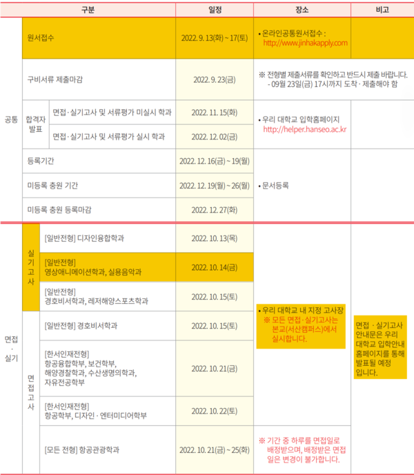한서대학교 항공관광학과의 2023학년도 입시일정은 9월17일 원서접수 마감을 완료하였으며, 10월 21일부터 10월 25일 사이 면접을 실시하며, 합격자 발표는 12월 2일 있을예정이다.
